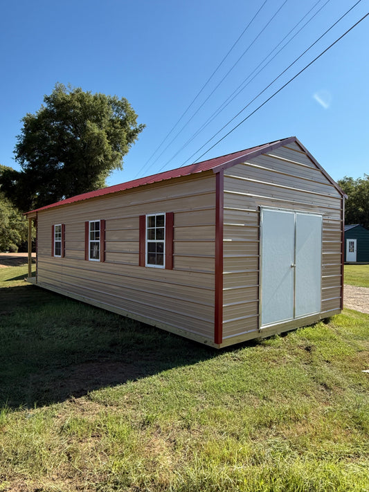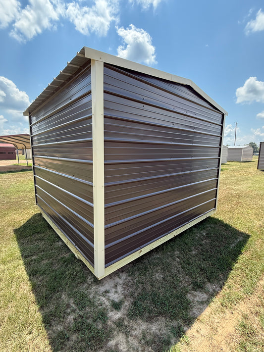 8x12 Regular Roof Portable Building - Brown/Taupe/Rustic Red Shutters